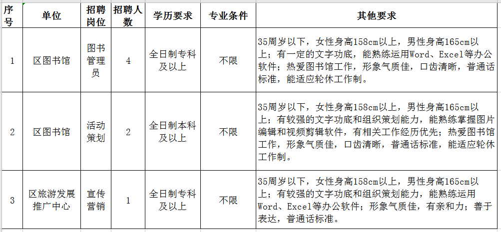 2021-01-21 22:12:55阅读()重庆公共招聘网根据工作需要,我公司受重庆市梁平区文化和旅游发展委员会委托面向社会公开招聘7名劳务派遣人员。具体招聘详情如下: