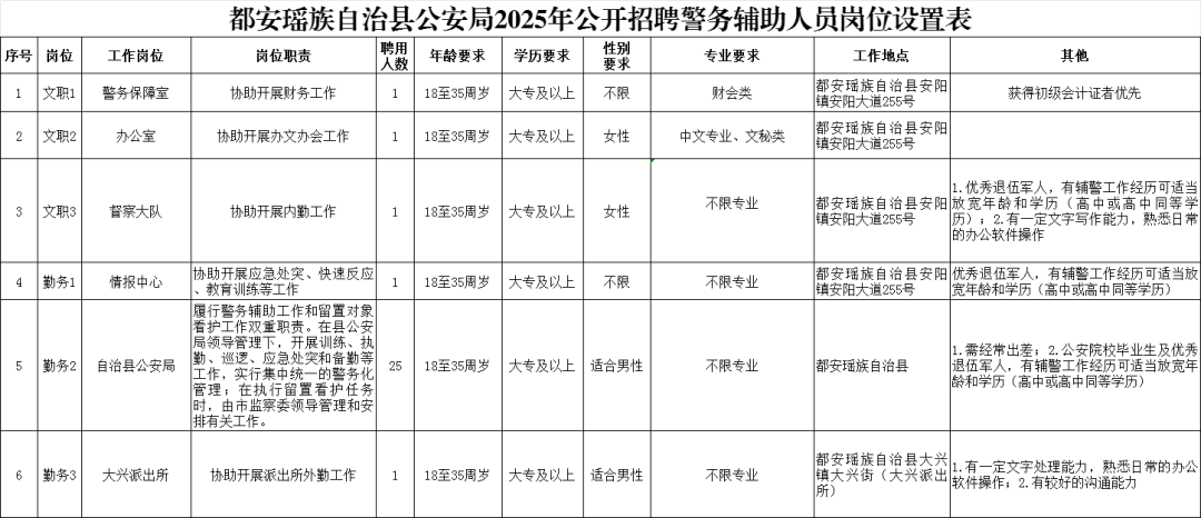 都安瑶族自治县公安局本次拟招聘警务辅助人员30人,具体招聘岗位、人数、资格条件详见《都安瑶族自治县公安局2025年公开招聘警务辅助人员岗位设置表》