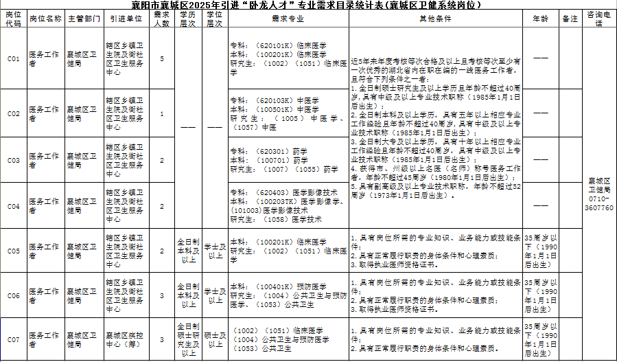 2025-06-06 14:42:00阅读()襄阳市卫生健康委员会襄阳市襄城区2025年度计划引进“卧龙人才”91名。其中,C类岗位为优秀医务工作者引才,共引进18名。其中,C01-C04岗面向湖北省内在职在编、专业技术精湛的一线医务工作者,引进10名;C05-C06岗面向普通高校全日制本科及以上学历毕业生,并取得相应学历学位,同时需取得执业医师资格证书,引进5名;C07岗面向国内普通高校或海外知名高校全日制硕士研究生及以上学历的应届、往届毕业生,引进3名。