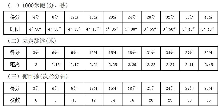 测试科目为1000米跑、立定跳远、俯卧撑,总成绩100分。