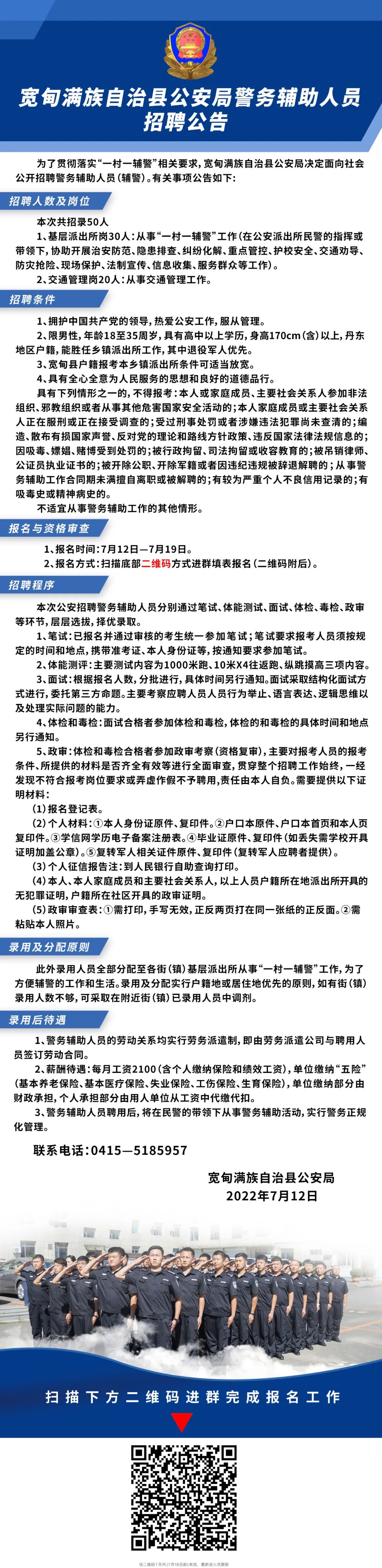 2022-07-24 16:24:14阅读()丹东公共招聘网为了贯彻落实“一村一辅警”相关要求,宽甸满族自治县公安局决定面向社会公开招聘警务辅助人员(辅警)。有关事项公告如下: