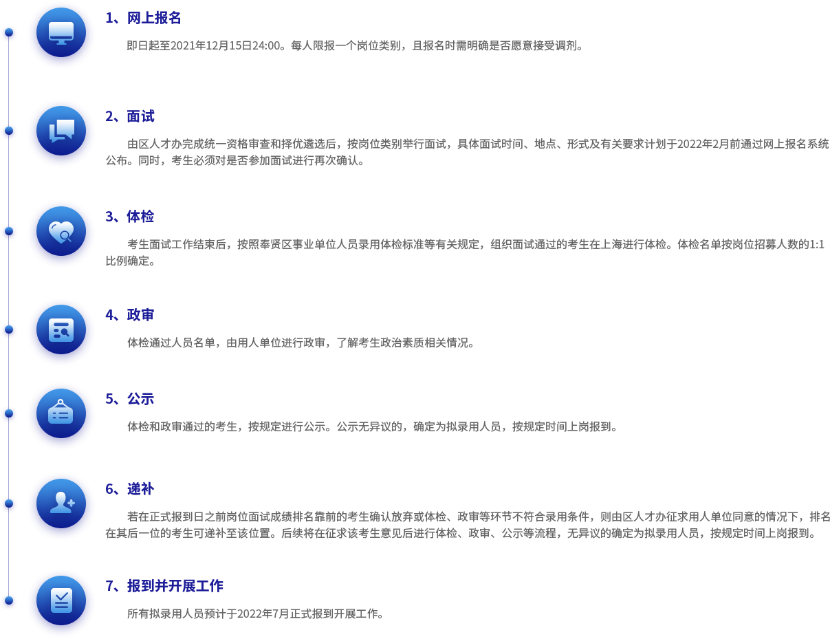 1.选调生结合储备人才项目同步开展,统一采取网上报名,网上报名时间截止到2021年11月10日24:00。 2.在规定时间内成功报名“奉贤区定向选调生”的人员,经奉贤区委组织部综合遴选后,按一定比例择优推荐参加上海市定向选调考试,与上海市2022年度考试录用公务员笔试一并进行(一考两用,即笔试成绩可同时在选调生招录和上海市2022年度考试录用公务员中使用)。 3.经上海市选调生笔试、面试、体检、考察、公示、录用等相关程序后,办理选调生公务员录用手续。录用职位根据人岗相适原则,由区委组织部统一安排。 4.选调生正式录用后,区委组织部负责安排选调生进行为期两年的基层培养锻炼(其中第一年为试用期),按照大学生村官进行管理。试用期满考核合格的,按照相关规定进行转正定级;不合格的,将取消录用。 5.报名参加选调的应届毕业生,应如实填报个人信息、提供任职和获奖证明材料。凡弄虚作假的,一律取消选调资格。