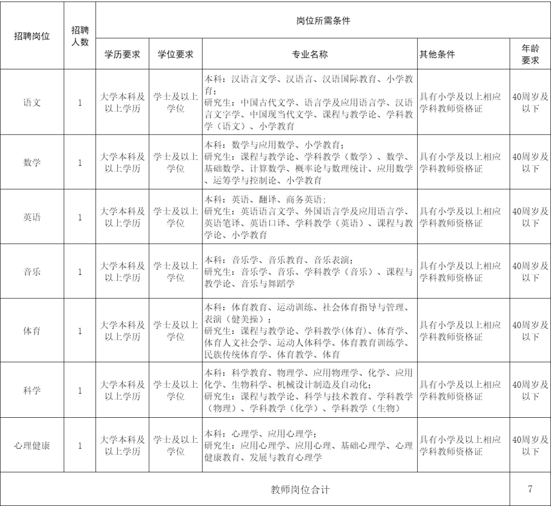 小学语文:5人、小学数学:3人、小学英语:2人、小学体育:1人、小学音乐:1人、小学美术:2人、小学道德与法治:1人 、小学信息技术:1人、财务:1人。