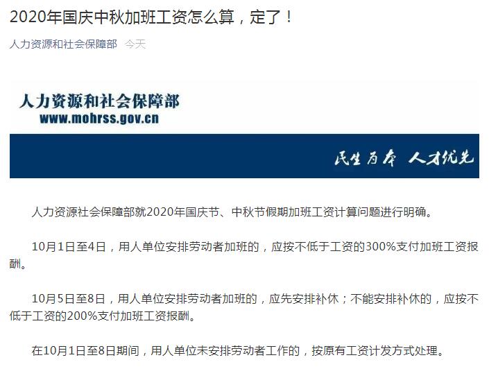 人社部明确国庆中秋加班工资:10月1日至4日加班发3倍工资
