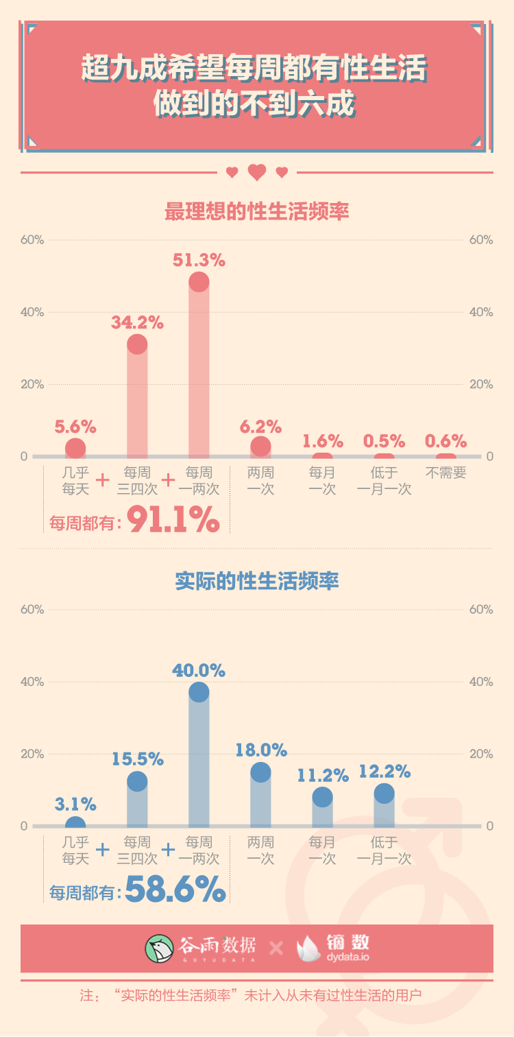 有91.1%的人最理想的性生活频率都高于一周一次,但只有58.6%的人能够实现。还有12.2%的人性生活频率低于一月一次。