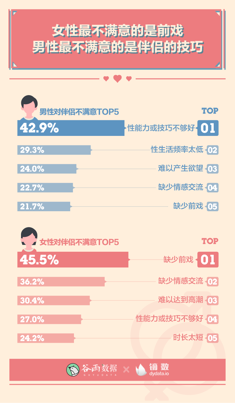 在对伴侣不满意的各项原因里,让女性最不满意的是“缺少前戏”,让男性最不满意的是“性能力或技巧不够好”。