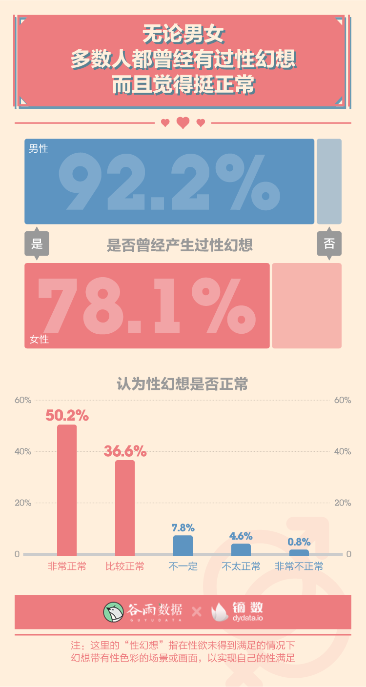 在我们的调查中,无论男女,多数人都曾经有过性幻想,男性产生过性幻想的比例超过了九成,更高一些。