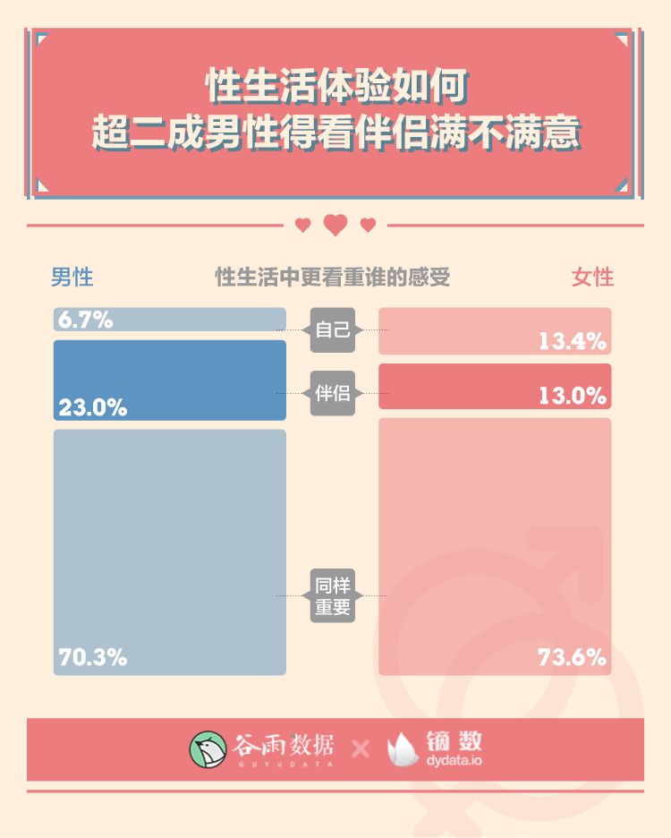 在我们的调查中,超过七成的人认为性生活中自己和伴侣的感受同样重要,但分性别看,男性比女性更看重伴侣的感受。