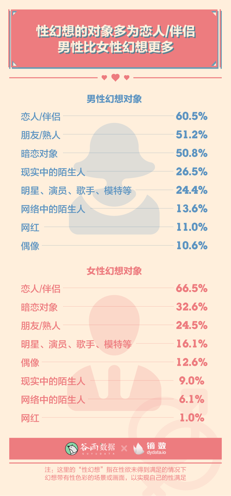 虽然不分男女,排名前三的性幻想对象都是:恋人/伴侣、暗恋对象、朋友/熟人,但男性的性幻想对象明显更加多元,女性则相对集中。