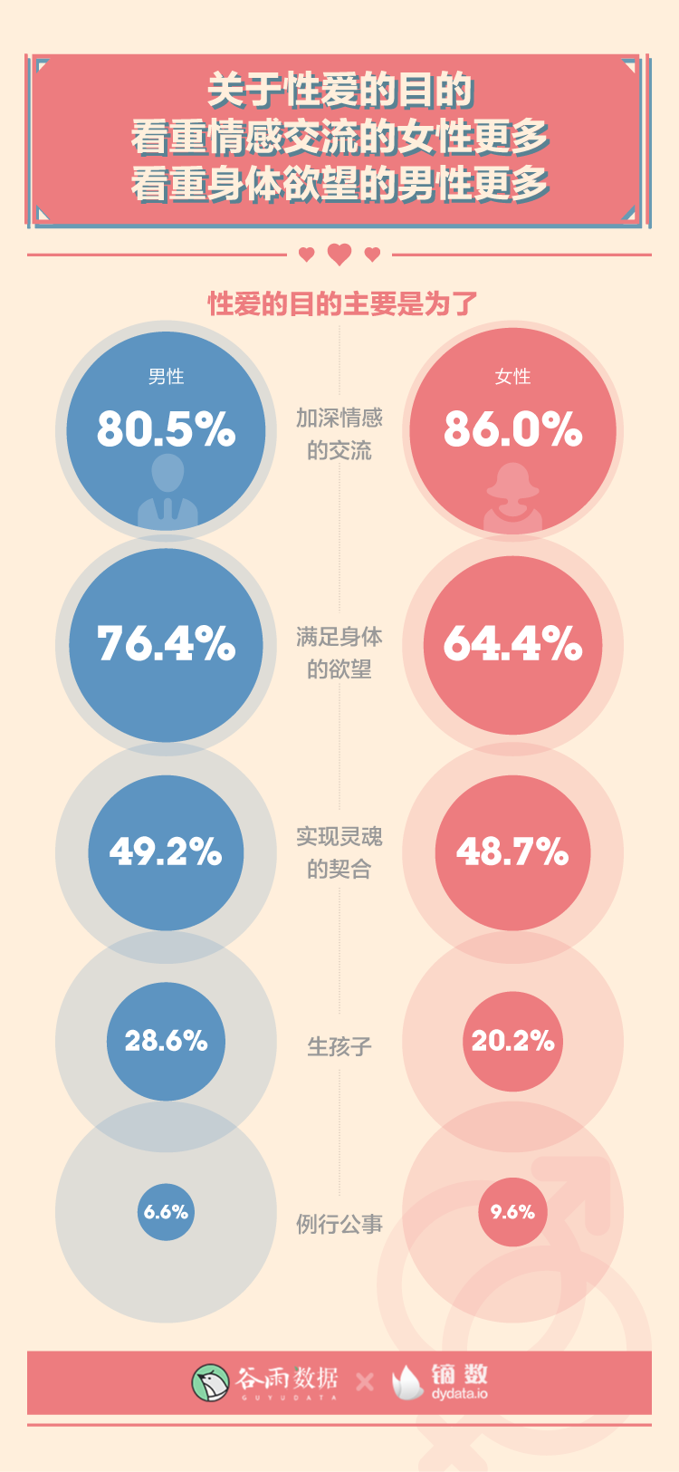 关于性爱的目的,男性倾向于“满足身体的欲望”的比例比女性高出12%,倾向于“生孩子”的比例比女性高出8.4%。“加深情感的交流”则是二者都最为重视的。