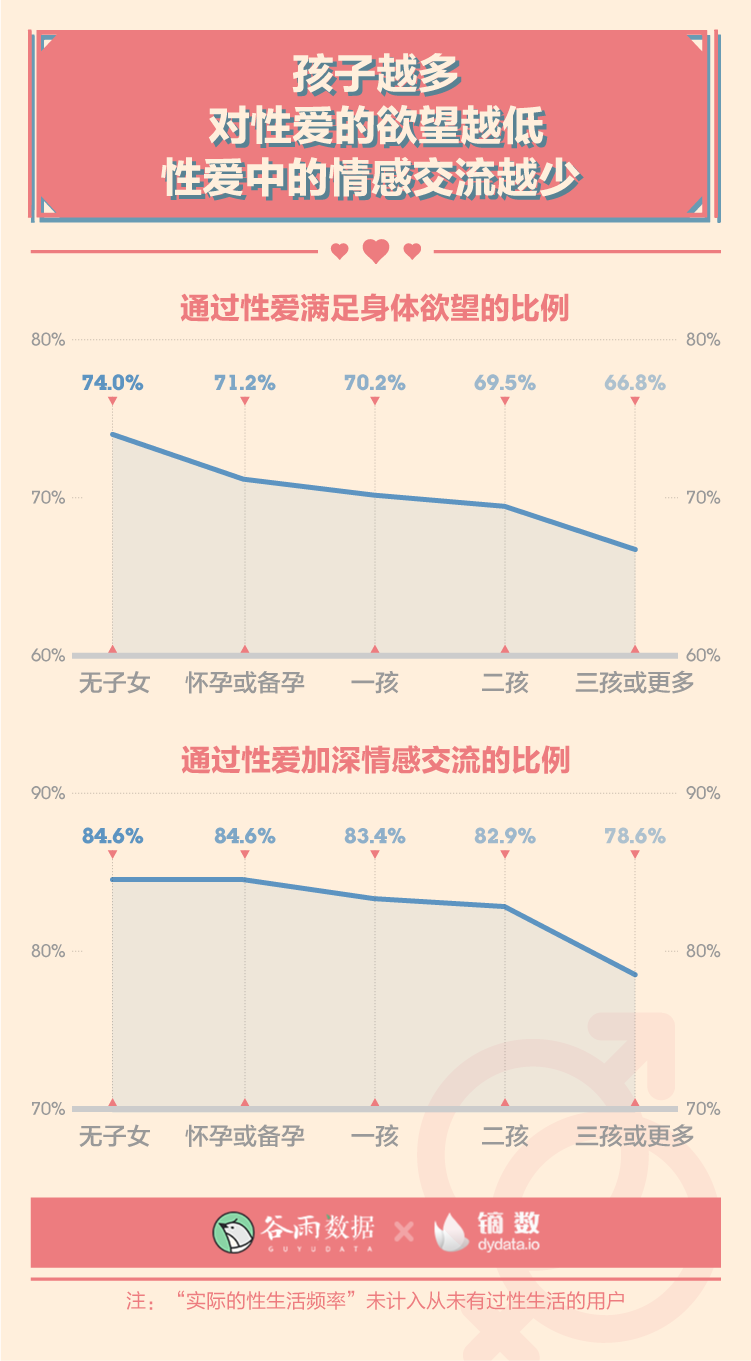 调查还显示,孩子越多,对性爱的欲望就越低,性爱中的情感交流就越少。 每一个孩子的出生,可能都在让无性婚姻越来越近。