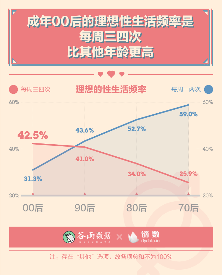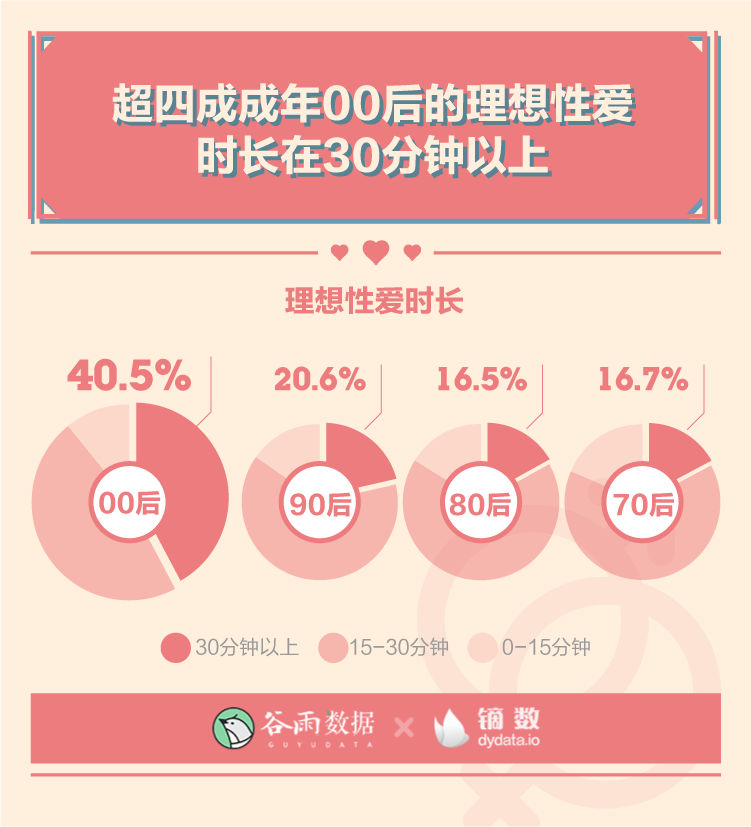 年轻的身体里装着更加旺盛的性需求。超四成的成年00后理想性生活频率是每周三四次,理想性爱时长在30分钟以上,这两个比例都比其他年龄更高。