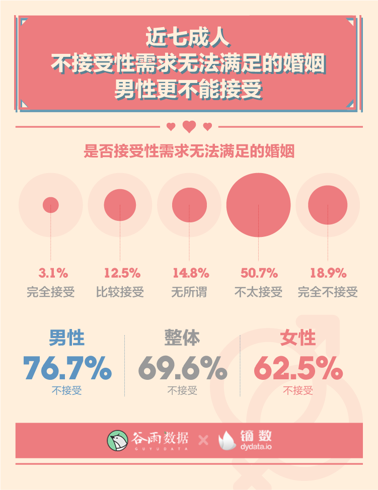性在婚姻中是否是必不可少的?对于大多数人来说,性需求无法满足都会成为婚姻的致命伤。76.7%的男性和62.5%的女性不接受性需求无法满足的婚姻。