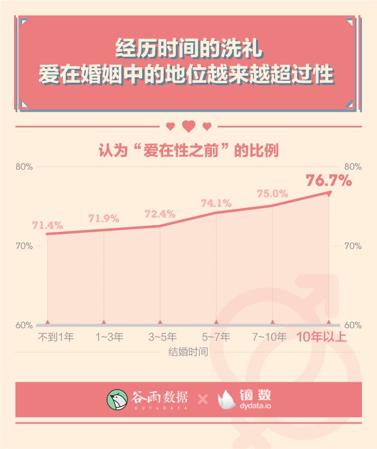 在所有结婚时间段中,结婚10年以上的人认为“爱在性之前”的比例达到最高,为76.7%。