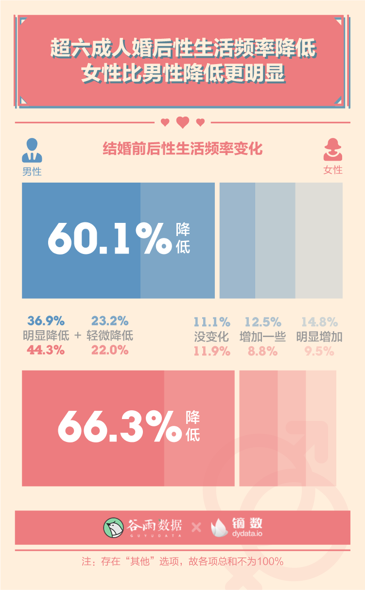 多数情况下,结婚会让性生活更少,尤其对女性而言。60.1%的男性、66.3%的女性在结婚之后性生活频率降低。
