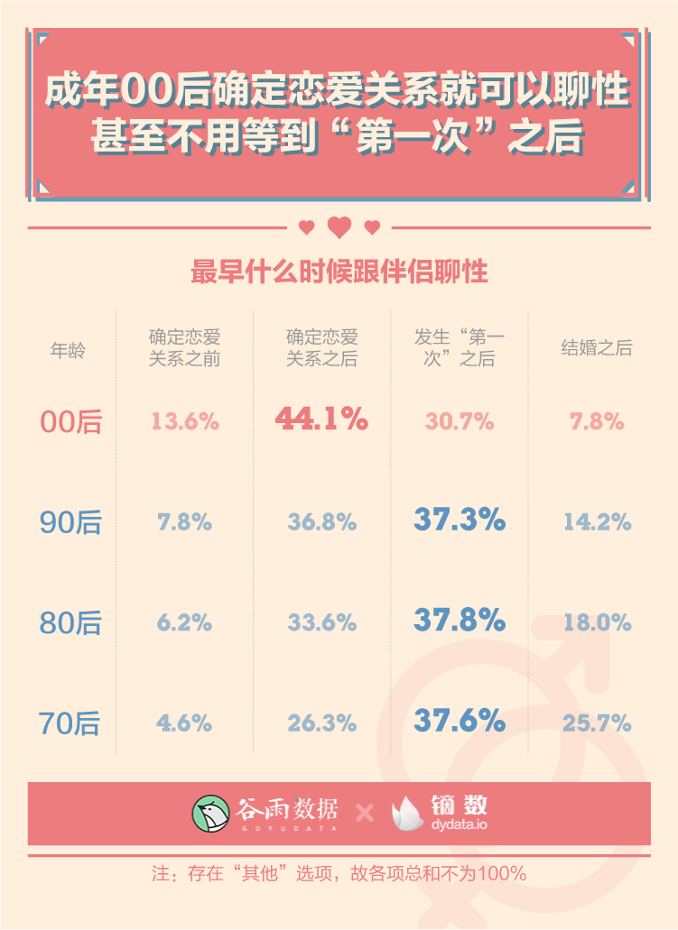 在性表达方面,00后的开放程度的确也更高。44.1%的成年00后认为确定恋爱关系就可以聊性,而其他年龄段更倾向认为要等到发生“第一次”之后。