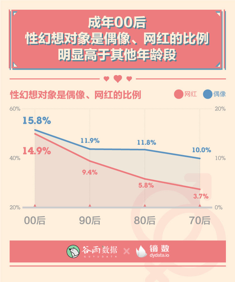 另外,作为网络时代的“土著”,成年00后们性幻想对象是偶像、网红的比例也明显高于其他年龄段。