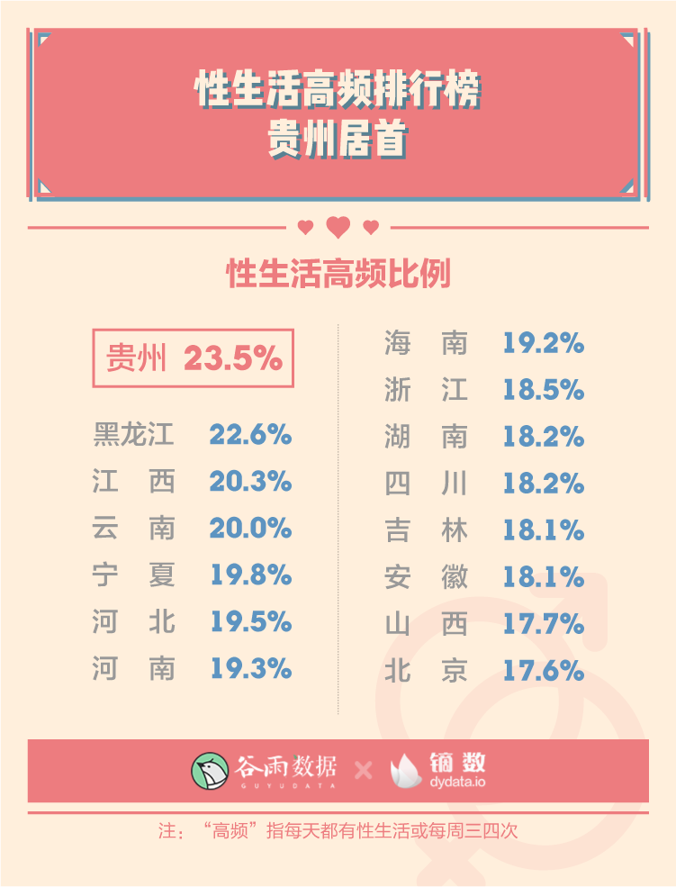 在谷雨数据2019年的调查中,贵州省56.1%的人每周都有性生活,这一比例高居各地区榜首,而今年……性生活频率排行榜中,贵州人民再次荣登榜首。