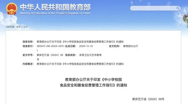 2024-11-25 09:07:59阅读()微言教育为切实加强中小学校园食品安全和膳食经费管理,近日,教育部印发了《中小学校园食品安全和膳食经费管理工作指引》(以下简称《指引》),聚焦校园餐关键领域和薄弱环节,细化操作流程和规范标准,进一步提升校园食品安全和膳食经费管理规范化、精细化、科学化水平。