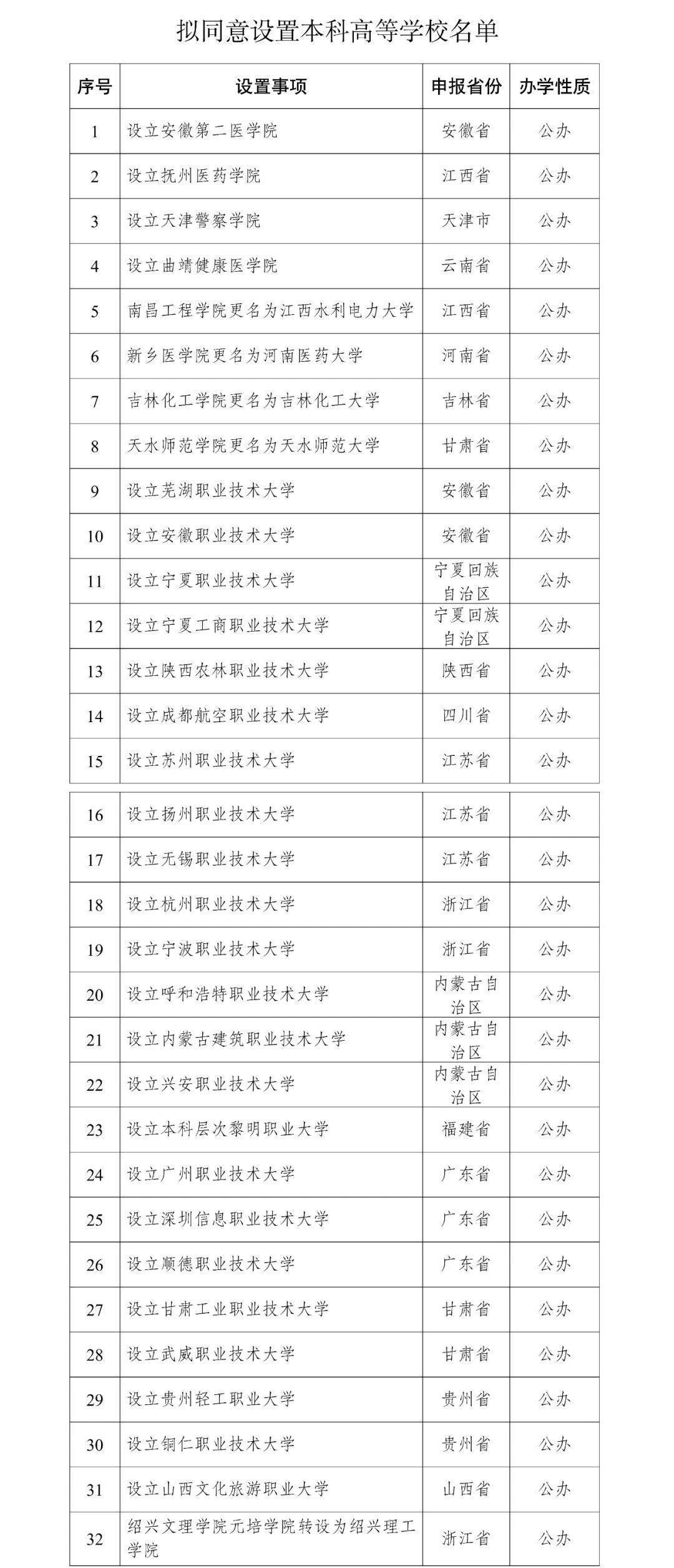 根据《中华人民共和国高等教育法》《普通高等学校设置暂行条例》《普通本科学校设置暂行规定》《本科层次职业学校设置标准(试行)》等有关规定以及第八届全国高等学校设置评议委员会考察评议结果,经教育部党组会议审议,拟同意设置安徽第二医学院等32所学校,现予公示。