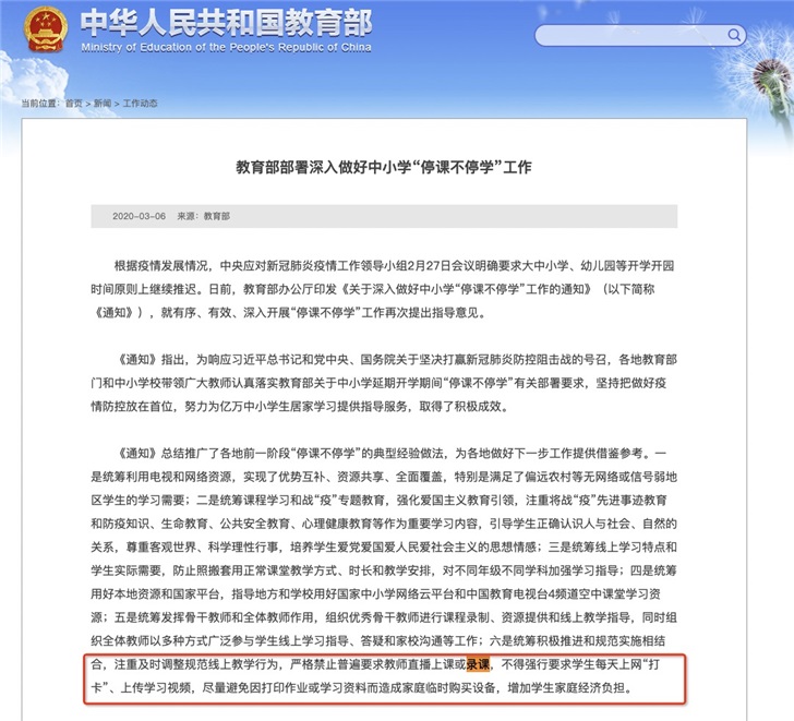 2020-03-07 10:40:54阅读()教育部国家教育部在3月6日发布了名为《教育部部署深入做好中小学“停课不停学”工作》,其中要求严格禁止普遍要求教师直播上课或录课,不得强行要求学生每天上网“打卡”、上传学习视频。