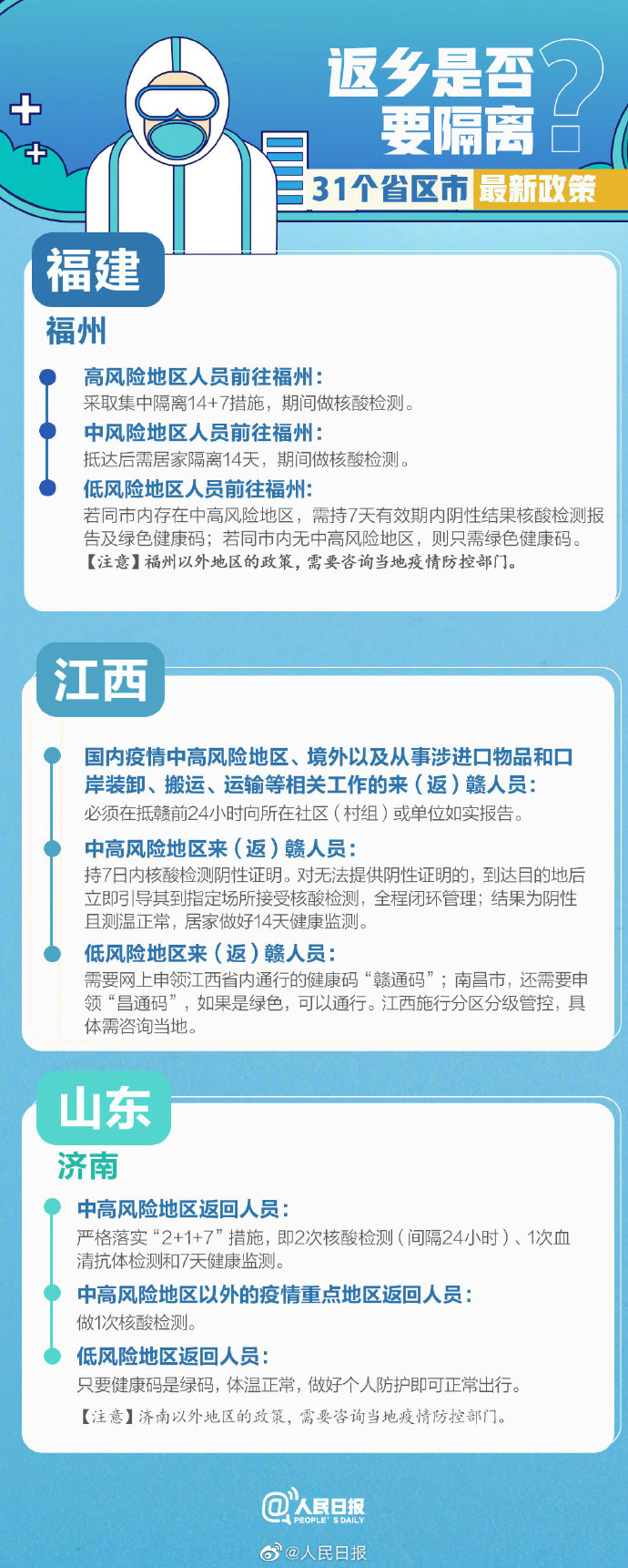 中、高风险地区人员倡议不返乡,若返乡需要定点集中隔离14日;低风险地区人员来福州只需要提供健康码绿码。