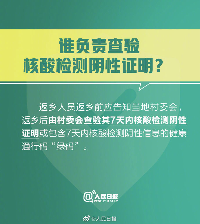 返乡人员返乡前应告知当地村委会,返乡后由村委会查验其7天内核酸检测阴性证明或包含7天内核酸检测阴性信息的健康通行码“绿码”。
