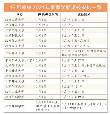 2021-02-18 11:03:33阅读()北京日报对于在京高校大学生而言,即将到来的2021年春季学期,“如期开学、延迟返校”将成为潮流。记者近日从官方渠道了解到,北京师范大学、北京交通大学、北京科技大学、北京化工大学等16所在京高校均发布最新通知,新学期在原计划的开学之日以线上教学方式开课,时间大多集中于3月1日;学生返校日期则延后至3月中下旬。