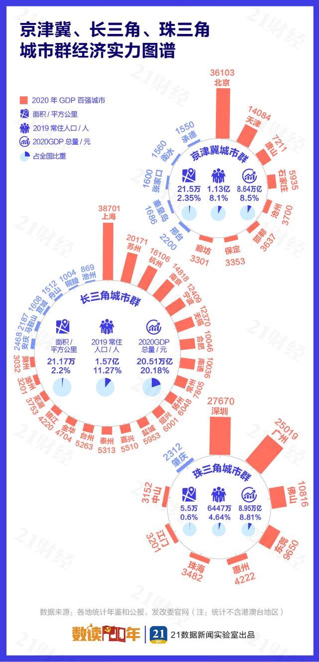 从经济体量来看,在19大国家级城市群中,长三角、珠三角、京津冀城市群的经济发展最为活跃。这三大城市群包含48个,以全国5%的土地面积吸纳了约24的人口,贡献了近四成的经济总量。