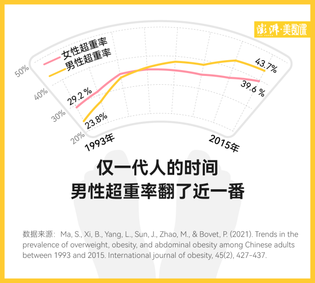 到了本世纪,国内男性超重的比例开始迅速增加,并最终反超。