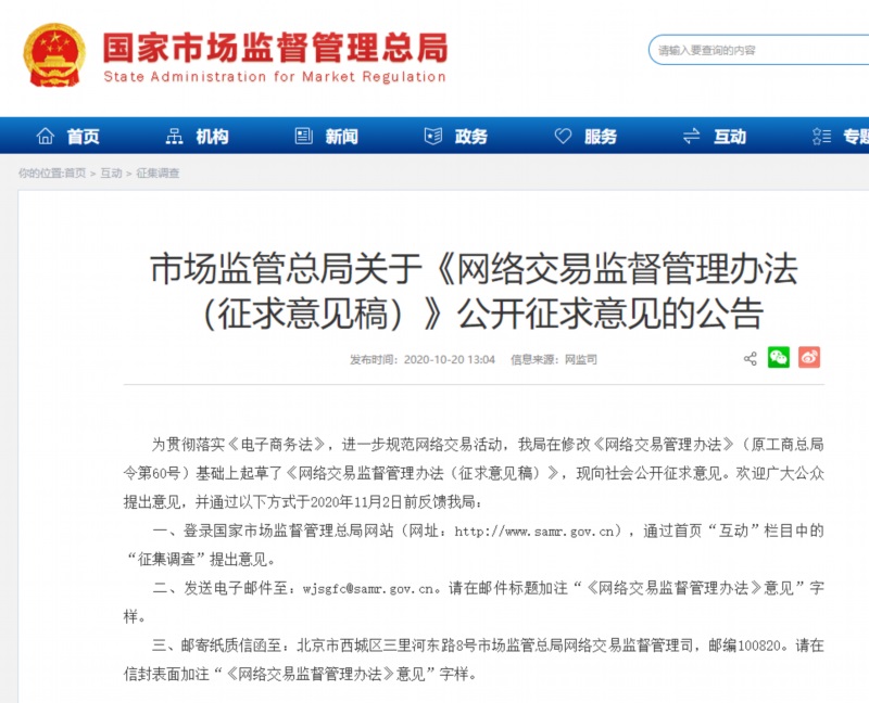 近日,国家市场监管总局公布了《网络交易监督管理办法(征求意见稿)》,进一步规范网络交易活动,将网络直播带货等网络交易新业态纳入监管范 ...