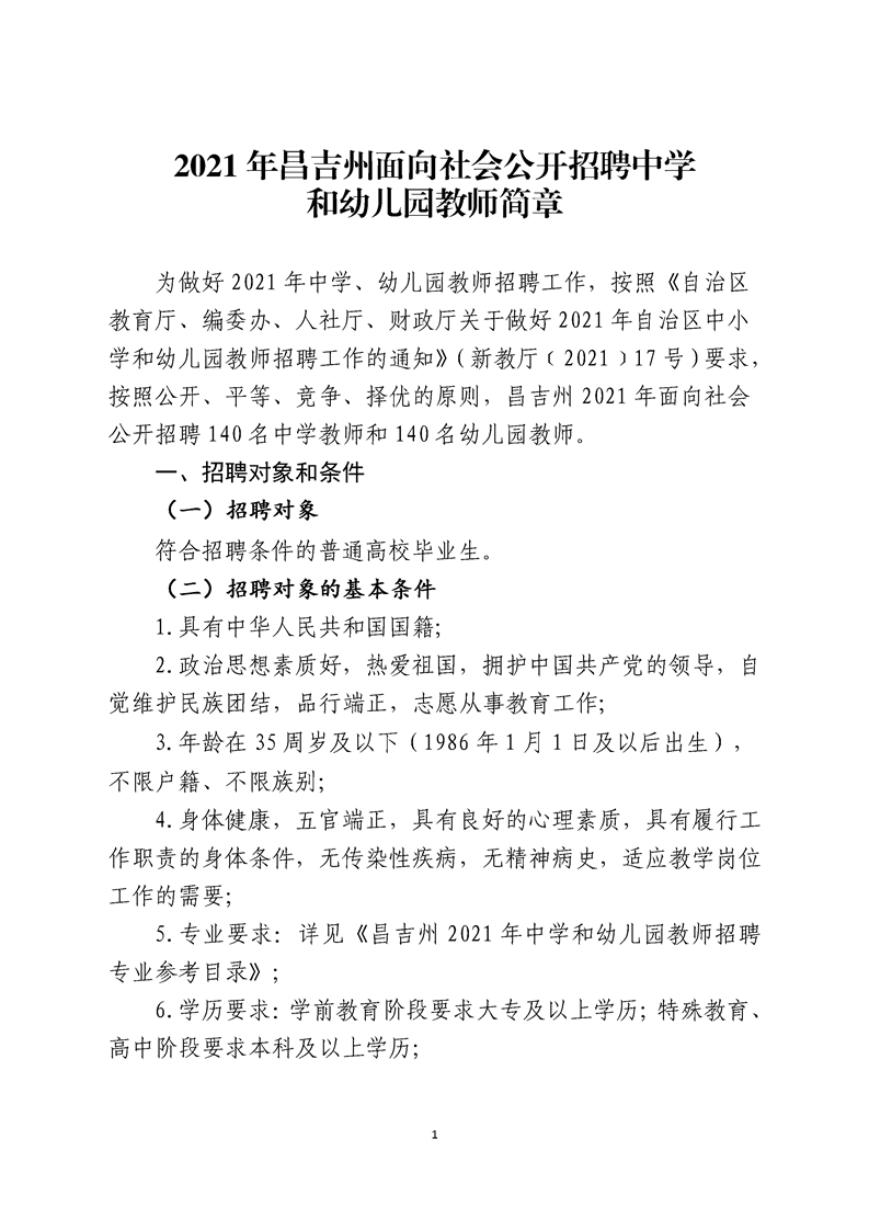2021年昌吉州面向社会公开招聘中小学和幼儿园教师简章